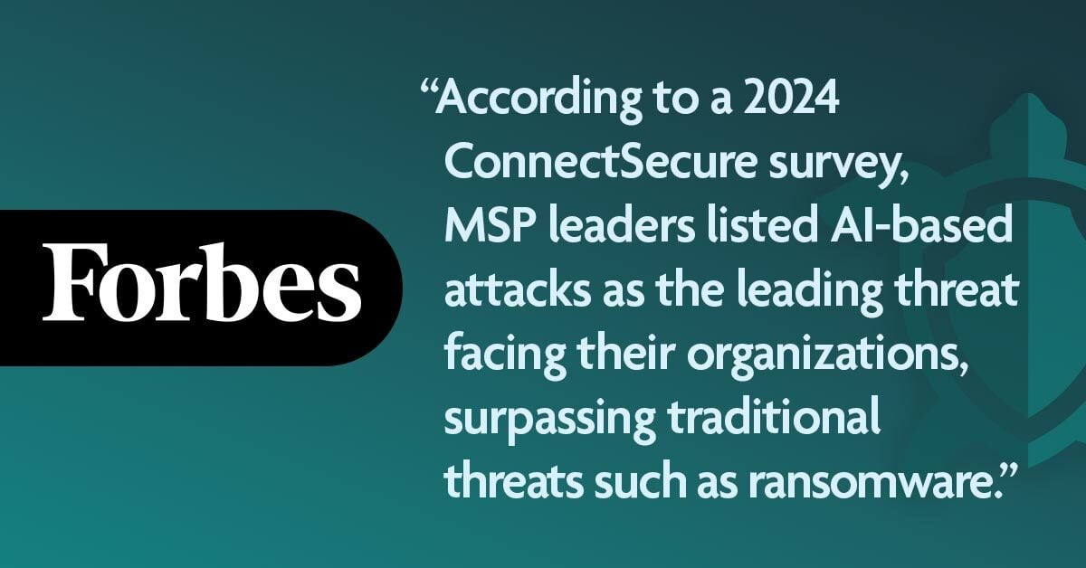 Written by Forbes Council Member and CyberSmart CEO Jamie Akhtar, the article details how MSPs can defend against the next generation of AI-powered attacks. He notes the ConnectSecure survey found MSP leaders listed AI-based attacks as the leading threat facing their organizations, surpassing traditional threats such as ransomware.