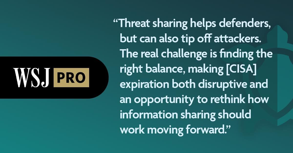 “Threat sharing helps defenders, but can also tip off attackers,” Peter told the WSJ. “The real challenge is finding the right balance, making [CISA] expiration both disruptive and an opportunity to rethink how information sharing should work moving forward.”